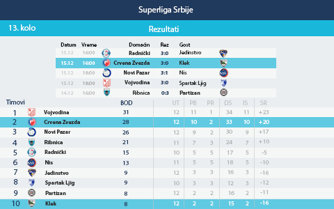 Prikaz rezultata sa utakmicama sa svim željenim informacijama. Navigacija rezultata po kolima. Automatsko računanje i prikazivanje tabela nakon unetih rezultata u različitim formatima i sa različitim podacima. Praćenje uživo rezultata u toku utakmica.